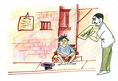 A blind boy sat on the steps of a building with a hat by his feet. He held up a sign which said: "I am blind, please help." There were only a few coins in the hat.